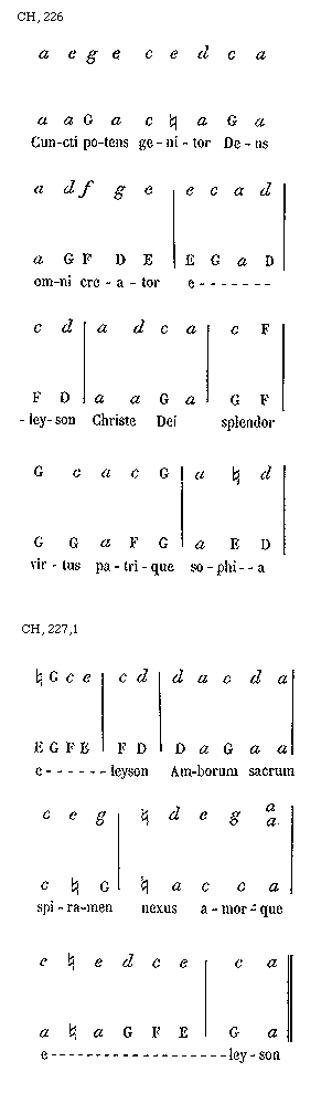 [CH, 226; text: a, e, g, c, d, G, [sqb], F, D, E, Cuncti potens genitor Deus omni creator eleyson, Christe Dei splendor virtus patrique sophia]