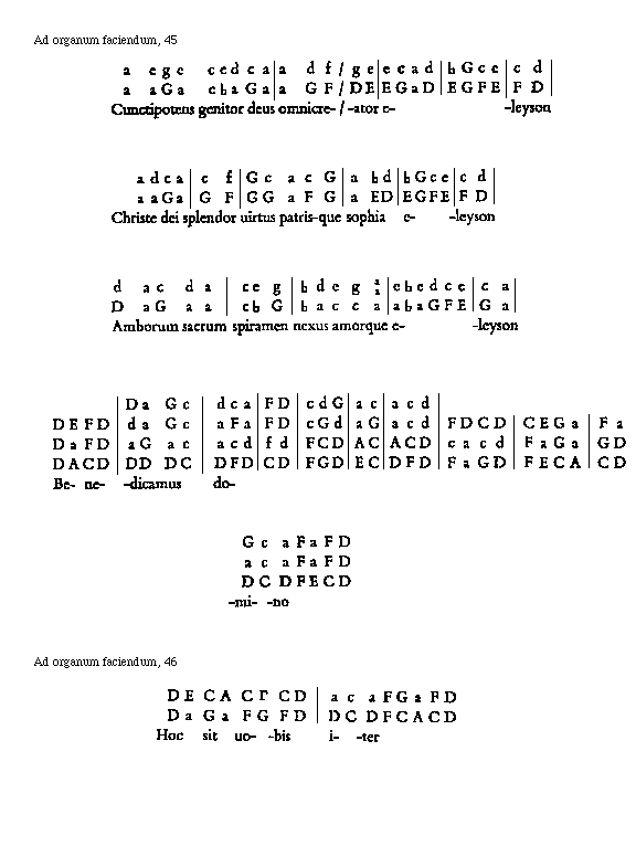 [45][f. 56v in marg.] [Ad organum faciendum, 45; text: a, [sqb], c, d, e, f, g, A, C, D, E, F, G, Cunctipotens genitor deus omnicreator eleyson, Christe dei splendor uirtus patrisque sophia eleyson, Amborum sacrum spiramen nexus amorque eleyson, Benedicamus domino]