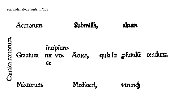 [Agricola, Rudimenta, f.Ciijr; text: Cantica tonorum, Acutorum, Grauium, Mixtorum, incipiuntur voce, Submissa, Acuta, Mediocri, quia in, altum, profundum, vtrunque, tendunt.]