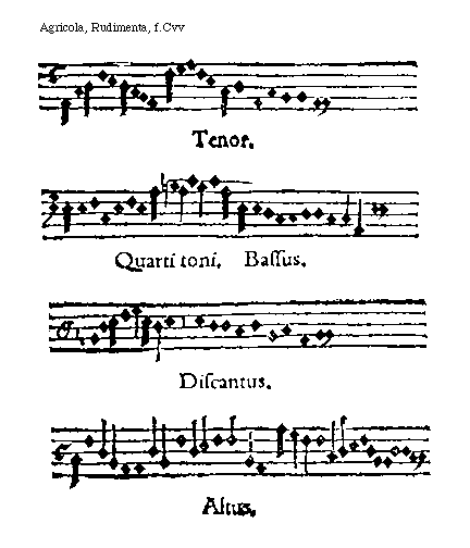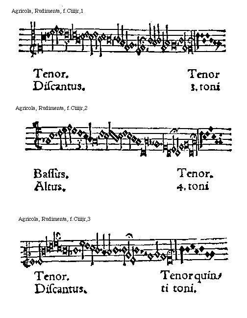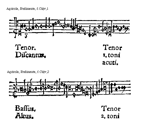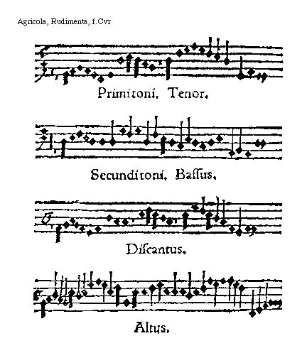 [Agricola, Rudimenta, f.Ciijv,1; text: Tenor. Discantus. Bassus. Altus. Tenor primi toni acuti.]