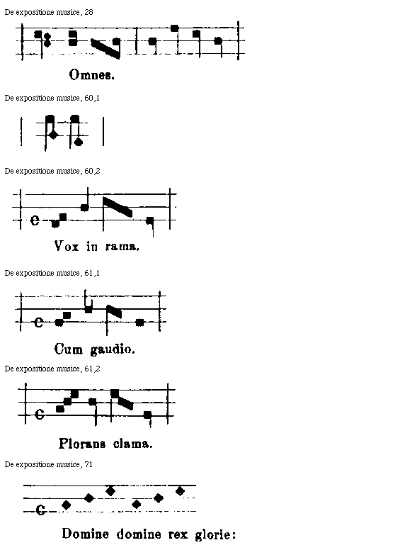 In primo igitur capitulo docet actor figurarum formas, representationes proprietatesque pariter et effectus. Et illud in duo membra diuiditur, eo quod due sunt species figurarum, quoniam omnes tales aut sunt simplices aut composite, ut patebit. Ideoque in primo membro agit de simplicibus et illud incipit ecce tibi formas et cetera, in secundo de compositis et illud ibi disce ligatarum et cetera. In secundo enim capitulo modorum species manifestat et illud incipit ibi est mensura modus et cetera. In tertio de figuris pausationum et naturis pariter dat doctrinam et illud incipit ibi hic dabo pausarum et cetera, in quarto de consonantiis huius artis dissonantias euitando et illud incipit ibi sunt bene qui pangunt et cetera. In quinto de discantu, et illud in duo membra diuiditur in quorum primo agit actor simpliciter de discantu, in secundo specialiter de copula, que est membrum ipsius discantus, nec ab eo differt nisi solummodo in figmentando; primum igitur incipit vnit discantus et cetera, secundum ibi copula cantores. In sexto et ultimo de organo speciali, quod omne genus cantuum superat dulcedine melodie et illud incipit nobis organica et cetera. Et sic patet in uniuerso libri ordinatio supradicta.