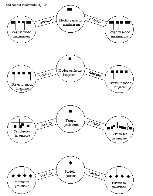 [Ars cantus mensurabilis, 128; text: Modus perfectus maximarum, Modus perfectus longarum, Termpus perfectum, Prolatio perfecta, Alteratio, Longe in modo maximarum, Breves in modo longarum, Semibreves in tempore, Minime in prolatione]