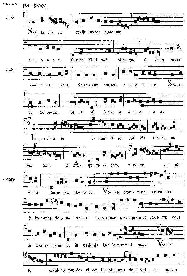 [89][MSD43:89; text: [fol. 19r-20v], f 19r, Sexta hora sedit super puteum. euouae. Christe fili dei. Si ego. f 19v, O quam metuendus est locus. Nesciens mater. Sextus ut Os iusti. Gloria. In gravitate tonum aio dulcis succine sextum. Responsorium Aspiciebam. Versus Ecce dominator. Surrexit dominus. f 20r, Venite exultemus domino iubilemus deo salutari nostro praeoccupemus faciem eius in confessione et in psalmis iubilemus ei. alia.]