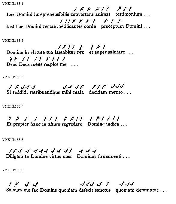 [VMKIII:168,1; text: Lex Domini inreprehensibilis convertens animas testimonium, Iustitiae Domini rectae laetificantes corda preceptum Domini]