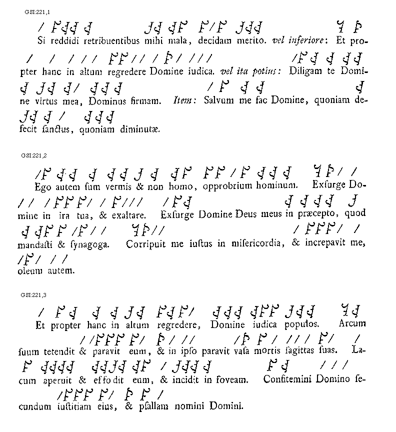 [GSI:221,1; text: Si reddidi retribuentibus mihi mala, decidam merito. vel inferiore: Et propter hanc in altum regredere Domine iudica. vel ita potius: Diligam te Domine virtus mea, Dominus firmam. Item: Salvum me fac Domine, quoniam defecit sanctus, quoniam diminutae.]