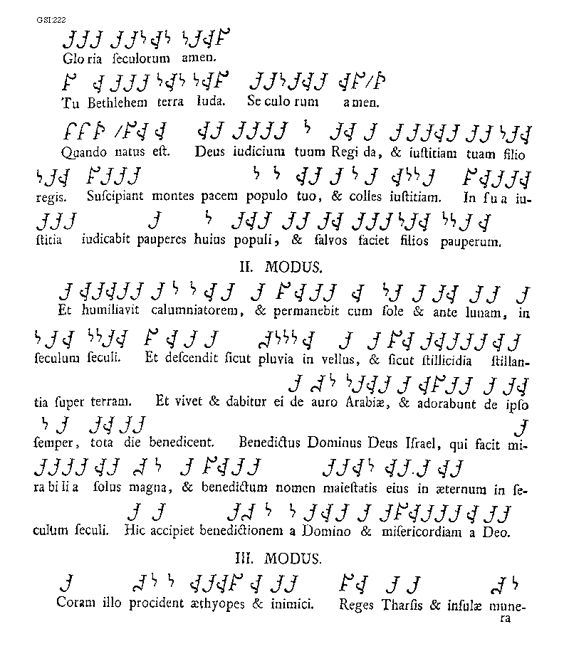 [GSI:222; text: Gloria seculorum amen. Tu Bethlehem terra Iuda. Seculorum amen. Quando natus est. Deus iudicium tuum Regi da, et iustitiam tuam filio regis. Suscipiant montes pacem populo tuo, et colles iustitiam. In sua iustitia iudicabit pauperes huius populi, et salvos faciet filios pauperum. Secundus modus. Et humiliavit calumniatorem, et permanebit cum sole et ante lunam, in seculum seculi. Et descendit sicut pluvia in vellus, et sicut stillicidia stillantia super terram. Et vivet et dabitur ei de auro Arabiae, et adorabunt de ipso semper, tota die benedicent. Benedictus Dominus Deus Israel, qui facit mirabilia solus magna, et benedictum nomen maiestatis eius in aeternum in seculum seculi. Hic accipiet benedictionem a Domino et misericordiam a Deo. Tertius modus. Coram illo procident aethyopes et inimici. Reges Tharsis et insulae munera]