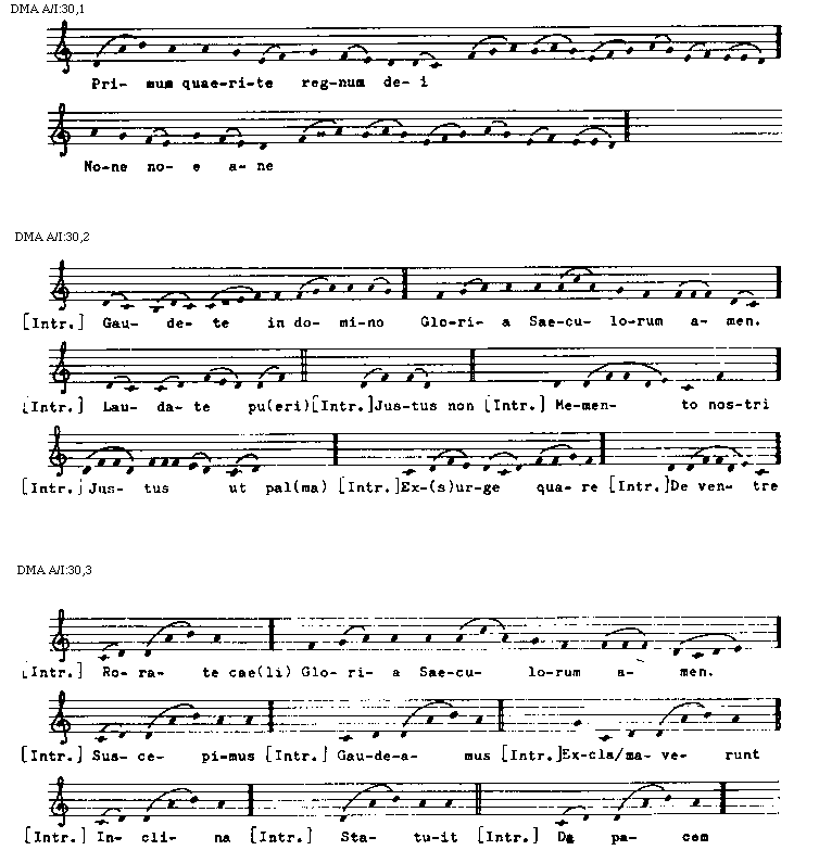 [DMA A/I:30,2; text: [Introitus] Gaudete in domino, Gloria Saeculorum amen. Laudate pu[eri], Justus non, Memento nostri, Justus ut pal(ma), Ex(s)urge quare, De ventre]