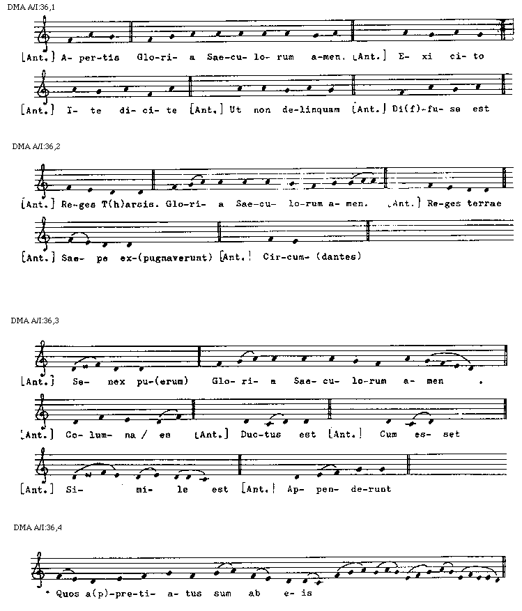 [DMA A/I:36,2; text: [Antiphona] Reges T(h)arsis. Gloria Saeculorum amen. Reges terrae, Saepe ex(pugnaverunt), Circum(dantes)]
