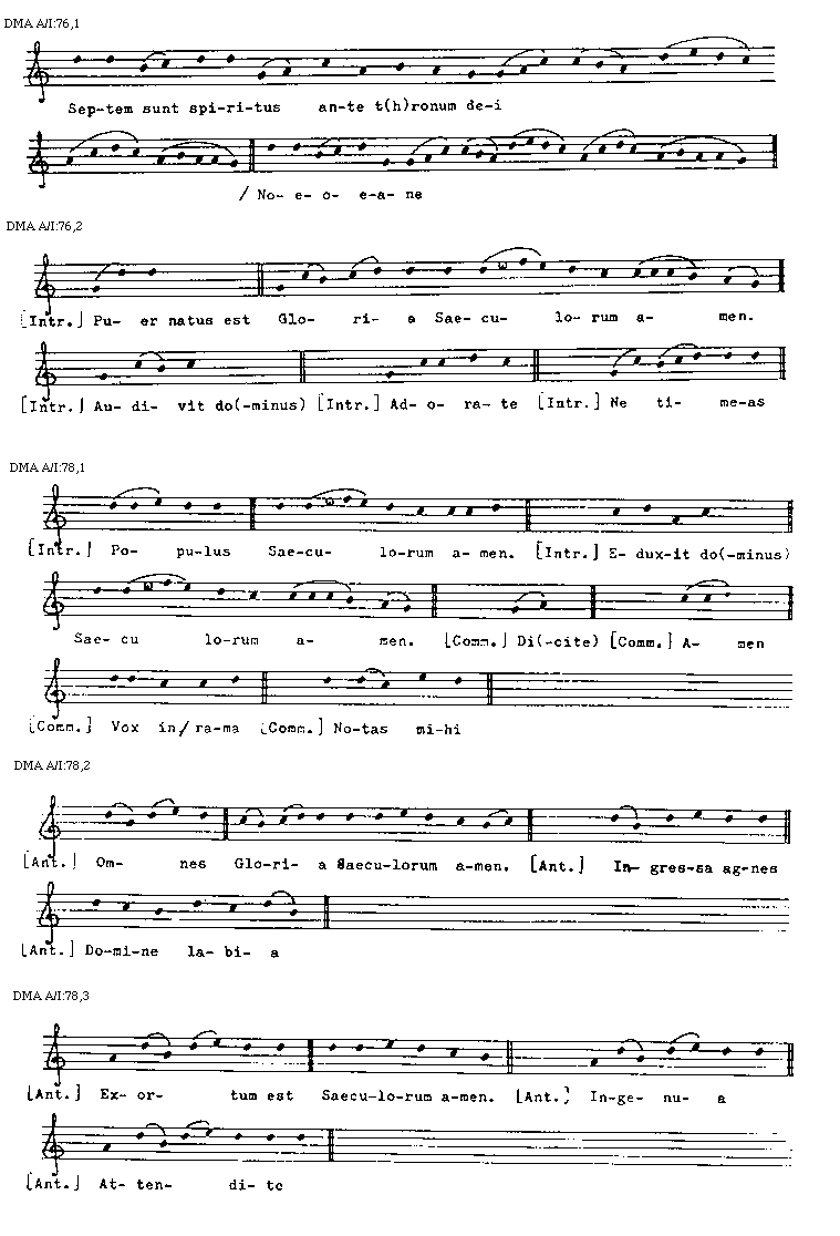[DMA A/I:44,2; text: Gloria Saeculorum amen, Terribilis est, [Introitus] Dominus dixit, Vultum, Ecce ad(venit), Gloria Saeculorum amen. [Communio] Exiit ser(mo), Narrabo, Gloria Saeculorum amen, [Antiphona] O sapientia, De Sion, Quem vidistis, Iuste, Psallite, Supra pec(tus)]