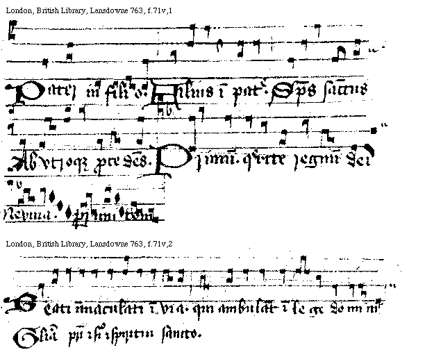 [London, British Library, Lansdowne 763, f.71v,1; text: Pater in filio. Filius in patre. Spiritus sanctus Ab vtroque procedens. Primum. querite regnum dei Neuma. primi toni]