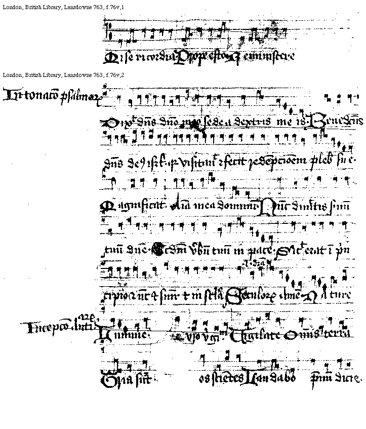 [London, British Library, Lansdowne 763, f.76v,2; text: Intonacio psalmorum, Dixit dominus domino meo sede a dextris meis. Benedictus dominus deus Israel. quia visitauit et fecit recempcionem plebis sue. Magnificat. Anima mea dominum. Nunc dimittis seruum tuum domine. Secundum verbum tuum in pace. Sicut erat in principio et nunc et semper et in secula, Seculorum Amen, prima differencia, Incepcio Antiphonarum. Nature, Lumine. ...uro virginum. Vigilate, Omnis terra, Tria sunt. Nos scientes, Laudabo, Impnum dicite.]