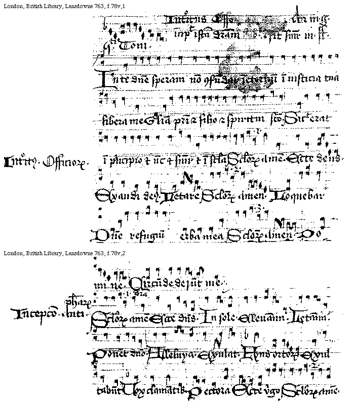 [f.[[77]]78v][London, British Library, Lansdowne 763, f.78v,1; text: quinti Toni. Introitus officiorum ..... a et in .g. incipit istam differenciam .... et finitur semper in .F. In te domine speraui non confundar in eternum in iusticia tua libera me Gloria patri et filio et spiritui sancto. Sicut erat in principio et nunc et semper et in secula Seculorum Amen. prima, Introitus. Officiorum. Ecce deus. Exaudi deus. Letare, secunda, Loquebar, Domine refugium, Verba mea, tercia, Domine. Circumdederunt me.]