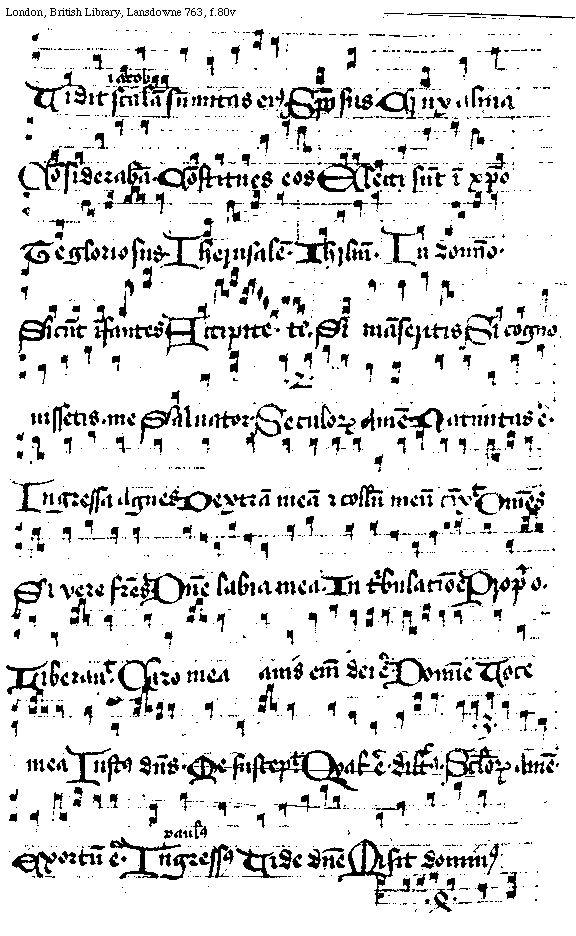 [f.[[79]]80v][London, British Library, Lansdowne 763, f.80v; text: Vidit [Iacob add. supra lin.] scalam summitas eius. Sponsus, Crux alma, Considerabam. Constitues eos, Electi sunt in Christo, Te gloriosus. Iherusalem. In domino. Sicunt infantes, Accipite. te. Si manseritis, Si cognouissetis. me, Saluator. secunda, Seculorum Amen. Natiuitas est. Ingressa Agnes, Dextram meam et collum meum cinxit, Omnes, Si vere fratres. Domine labia mea. In tribulacione, Proprio. Liberauit. Caro mea, .auis enim dei est. Domine, Voce mea, Iustus dominus. Me suscepit. Qualis est dilectus. tercia, Exortum est. Ingressus [Paulus add. supra lin.], Vide domine, Misit dominus, quarta]