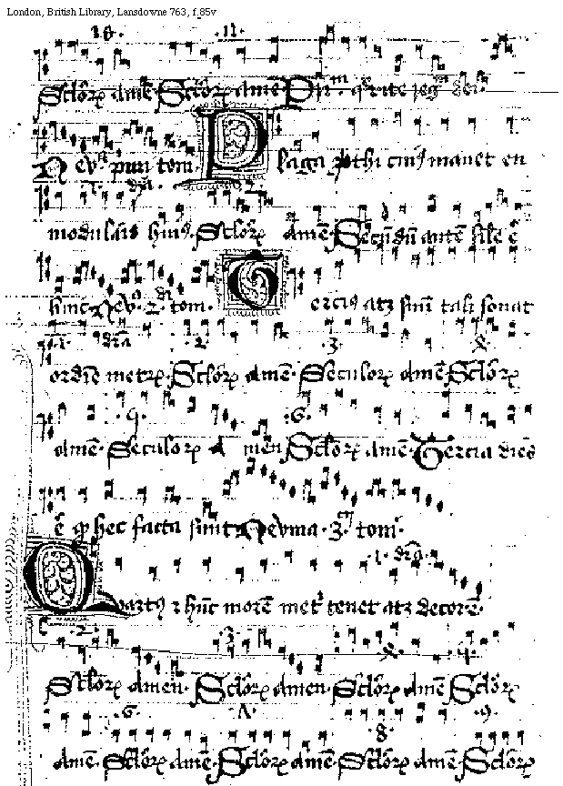 [f.[[85]]86r][London, British Library, Lansdowne 763, f.86r; text: Amen. Quarta Vigilia venit ad eos. Neuma quarti toni. Hanc quintus formam metri tenet ecce sonoram. prima differencia, secunda, Seculorum Amen, tercia, Quinque prudentes intrauerunt ad nupcias Neuma quinti toni. Vt metra iam primus sic format singula sextus, prima differencia et vltima, Sexta hora sedit super puteum. Neuma sexti toni. Septimus absque mora sic metrum format in hora, quarta, quinta, Septem sunt spiritus ante tronum dei. Neuma septimi toni. Sic sonat octauus]