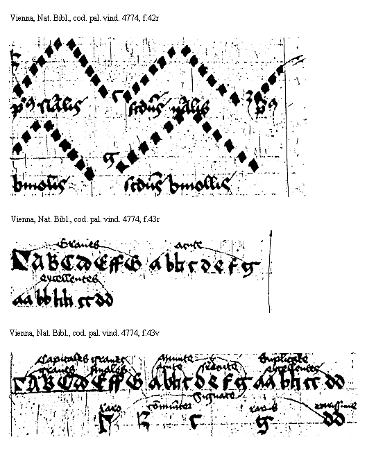 [Vienna, Nationalbibliothek, cod. pal. vind. 4774, f.43v; text: [Gamma], A, B, C, D, E, F, G, a, b[sqb], c, d, e, f, g, aa, cc, dd, graues, finales, acute, superacute, excellentes, Capitales graues, Minute, duplicate, Signate, raro, communiter, rarius, rarissime]