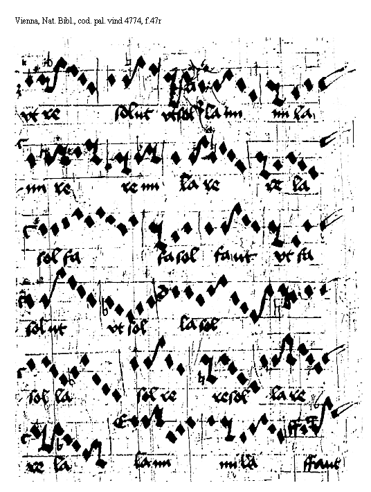 [Vienna, Nationalbibliothek, cod. pal. vind. 4774, f.86v,3; text: dyapason, dyapaente, dyatesseron, G, a, [sqb], c, d, e, f, g]