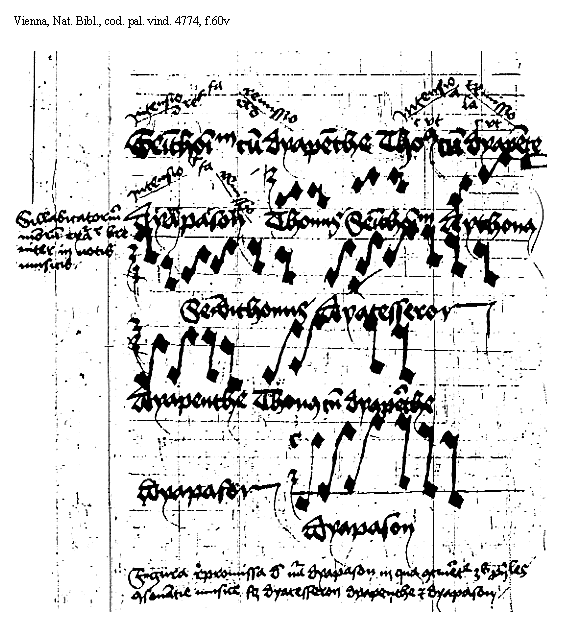 [f.60v][Vienna, Nationalbibliothek, cod. pal. vind. 4774, f.60v; text: Intensio, remissio, d, f, re, fa, vt, c, Semithonium cum dyapenthe, Thonus cum dyapente, a, la, Dypason, Sillabicatorium modorum exemplariter breuiter in notis musicis, Figura repromissa de natura dyapason in qua continentur tribus principales consonancie musice scilicet dyatesseron dyapenthe et dyapason, Thonus, Semithonium, Dythonus, Semidithonus, Dyatesseron, Dyapenthe]