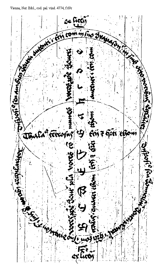[f.68r]a acutum regulariter. licencialiter autem a [Gamma] greco vsque ad c acutum Et nota sicut dictas figuras intuenti patet quomodo quere voces proprie dicuntur plagalium. vtputa tres littere priores inferioris circuli cuiuslibet figure de numero quattuor figurarum Quere vero proprie dicuntur autentorum vt puta tres littere superioris circuli. Littere vero in medio duorum centrorum connexorum posite quarum numerus semper est quinarius. Dicuntur communes vsque thono Et sicut declaratum est de duabus figuris primi et secundi thoni. ita de singulis intelligatur/