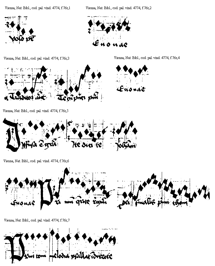 [Vienna, Nationalbibliothek, cod. pal. vind. 4774, f.80r,3; text: Tercius habet tenore tali in cantu isto tonari]