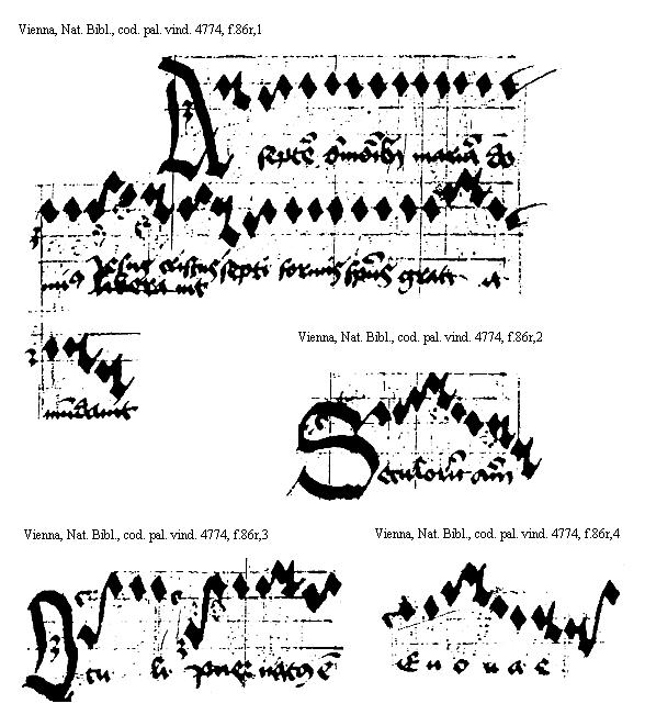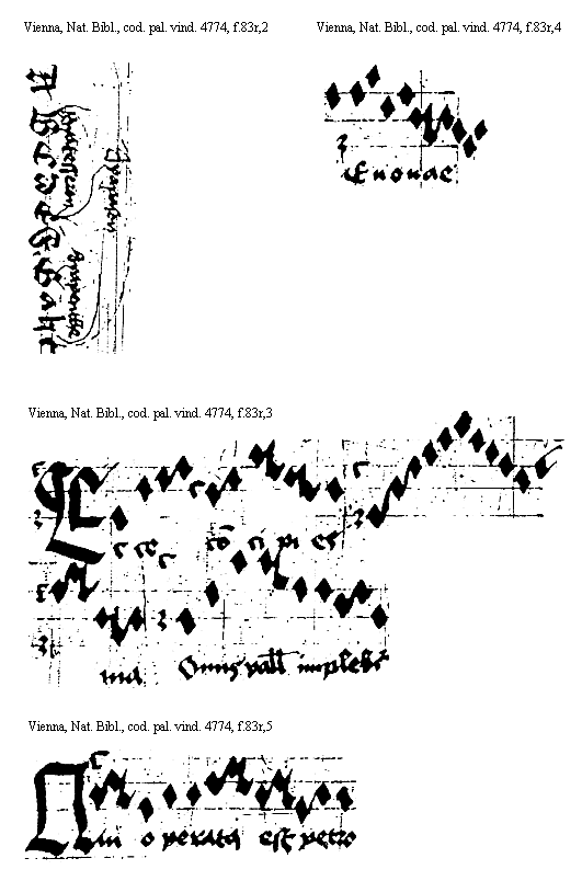 [Vienna, Nationalbibliothek, cod. pal. vind. 4774, f.83r,3; text: Ecce concipies, Alma, Omnis valle implebitur]