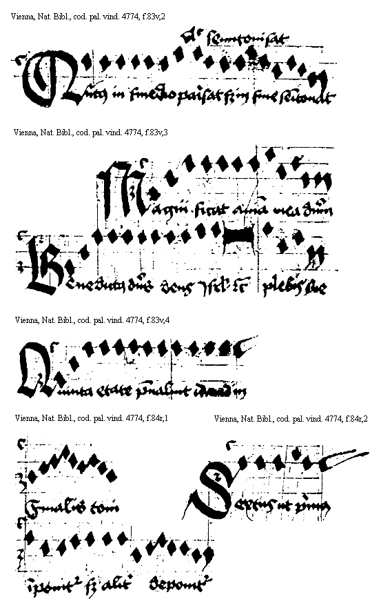 [Vienna, Nationalbibliothek, cod. pal. vind. 4774, f.83v,3; text: Magnificat anima mea dominum, Benedictus dominus deus Israel et cetera plebis sue]