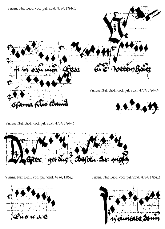 [Vienna, Nationalbibliothek, cod. pal. vind. 4774, f.84v,3; text: Veni in ortum meum, Exortum est, Veterem hominem, Osanna filio David]