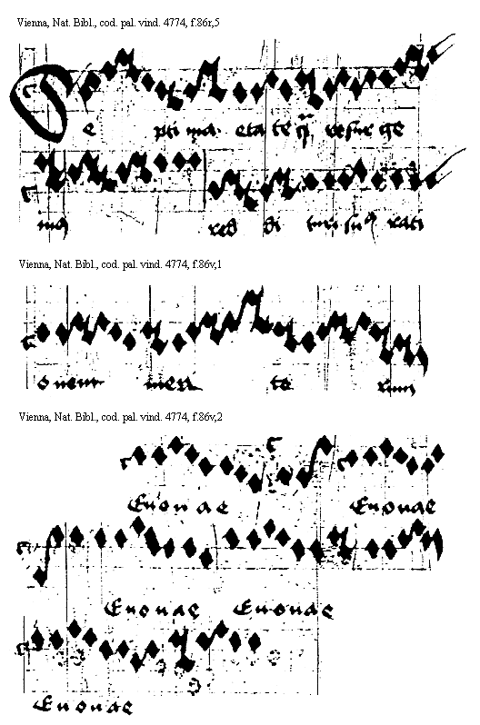 [Vienna, Nationalbibliothek, cod. pal. vind. 4774, f.79v,8; text: Tercia dies quod hec facta sunt, finalis tercii toni]