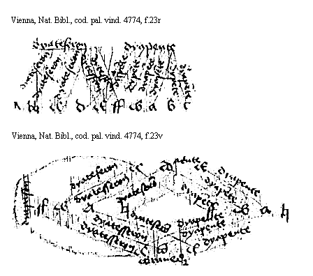 [Vienna, Nationalbibliothek, cod. pal. vind. 4774, f.23r; text: dyateseron, dyapente, A, b[sqb], C, D, E, F, G, a, b, c]