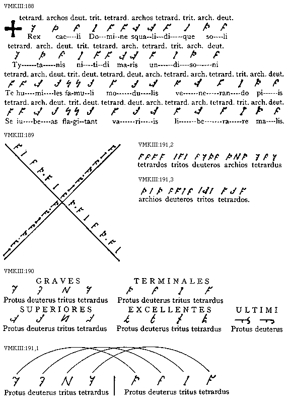 [194]superiorem deuterum et archoum. Quinta terminalem tetrardum. Sexta superiorem archoum, tritum, deuterum. Septima superiorem archoum et terminalem tetrardum. Octava terminalem tetrardum. Tercii membri prima sillaba superiorem archoum. Secunda superiorem tritum. Tercia superiorem deuterum. Quarta superiorem archoum. Quinta terminalem tetrardum. Sexta superiorem deuterum. Septima terminalem tetrardum. Octava superiorem archoum. Quarti membri prima sillaba superiorem deuterum. Secunda terminalem tetrardum. Tercia superiorem archoum. Quarta terminalem tetrardum et tritum. Quinta terminalem archoum. Sexta trito producto terminalem tetrardum, superiorem archoum et terminalem tetrardum. Septima terminalem tritum et deuterum. Ultima consistit in terminali deutero. Sic itaque sonus omnis dum suo semetipso nomine canit, facile in canendo sentitur, cuius quisque sit nominis. Iuvat etiam, si dum forte in sono quolibet dubitatur, terni vel quaterni sursum seu iosum in ordine soni rimentur ab eodem sono seu ad eundem, et mox, quis ille fuerit, agnoscetur, donec usu efficiatur, ita sonos quoque posse canere quemadmodum litteras legere. Et haec utcumque dixerimus incipientium studia adiuvantes; demonstrandum nunc, prout possumus, quomodo haec quattuor sonorum vis modos octo moderetur, quos abusive tonos dicimus, et fiat dispositio talis: Sternantur in ordine veluti quaedam cordae e sonorum notis singulis e regione positis procedentes, quibus cordis inserantur melodiae quattuor tonorum principalium, ut eorum ratio et videndo et audiendo valeat approbari. Una ergo modulatio incipiat a superiore proto [signum] et in protum finalem definiat [signum]. Altera a deutero superiore [signum] et deutero finali [signum] terminetur. Tercia vero a trito superiore [signum] et finali eodem [signum] finiatur. Quarta a superiore tetrardo [signum] et consistat in tetrardo finali [signum]. Una eadem modulatio omnium solo epogdoo, id est