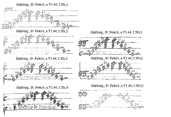 [Salzburg, St. Peter's, a.VI.44, f.40v,2; text: sol, re, la.]