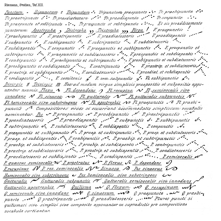[Taf.XII.][Neumentafel, taf. XII; text: Punctum, Bipunctum, Tripunctum, Tripunctum praepuncte, Tripunctum praebipuncte, Tripunctum praetripuncte, Tripunctum praediatessare, Tripunctum praediapente, Tripunctum conpuncte, Tripunctum praepuncte et subbipuncte, Tripunctum praepuncte et subtripuncte, Et sic proadditamento punctorum. Apostropha, Distropha, Tristropha, Virga, Virga praepunctis, Virga praebipunctis, Virga praetripunctis, Virga praediatessaris, Virga praediapentis, Virga subpunctis, Virga subbipunctis, Virga subtripunctis, Virga subdiatesseris, Virga subdiapentis, Virga conpunctis, Virga praepunctis et subbipunctis, Virga praepunctis et subtripunctis, Virga praepunctis et subdiatesseris, Virga praepunctis et subdiapentis, Virga conbipunctis, Virga praebipunctis et subtripunctis, Virga praebipunctis et subdiatesseris, Virga praebipunctis et subdiapentis, Virga contripunctis, Virga praetripunctis et subdiatesseris, Virga praetripunctis et subdiapentis, Virga condiatesseris, Virga praediatesseris et subdiapentis, Virga condiapentis, Virga semitonis, Virga semitonis subpunctis, Virga semitonis subbipunctis, Bivirgis, Trivirgis, Hae ad modum virgae simplicis praepositis et subpositis apponantur neumis. Flexa, Flexa dependens, Flexa resupina, Flexa semivocalis sive innodans, Flexa sinuosa, Flexa gutturalis, Flexa gutturalis subpunctis, Flexa hemivocalis sive substringens, Flexa apostrophis, Flexa praepunctis, Flexa praebipunctis, Compositiores voces si occurrant accommodatis simplicium vocabulis nominentur. Pes, Pes praepunctis, Pes praebipunctis, Pes praetripunctis, Pes praediatessaris, Pes praediapentis, Pes subpunctis, Pes subbipunctis, Pes subtripunctis, Pes subdiatesseris, Pes subdiapentis, Pes conpunctis, Pes praepunctis et subbipunctis, Pes praepunctis et subtripunctis, Pes praepunctis et subdiatesseris, Pes praepunctis et subdiapentis, Pes conbipunctis, Pes praebipunctis et subtripunctis, Pes praebipunctis et subdiatesseris, Pes praebipunctis et subdiapentis, Pes contripunctis, Pes praetripunctis et subdiatesseris, Pes praetripunctis et subdiapentis, Pes condiatesseris, Pes praediatesseris et subdiapentis, Pes condiapentis, Pes semivocalis, Pes quassus semivocalis, Pes prostratus, Pes flexus, Pes dependens, Pes resupinus, Pes resupinus semivocalis, Sinuosa, Pes sinuosus, Hemivocalis sive substringens, Pes hemivocalis sive substringens, Gutturalis, Gutturalis subpunctis, Gutturalis semivocalis sive innodans, Gutturalis apostrophis, Quilisma, Quilisma flexum, Quilisma resupinum, Quilisma semivocale sive innodans, Quilisma sinuosum, Quilisma praepuncte, Quilisma praebipuncte, Quilisma praetripuncte, Quilisma praediatessaris, Plures puncti si quilismati sive simplici sive composito apponantur ex supradictis pro compositione vocabula sortiantur.]