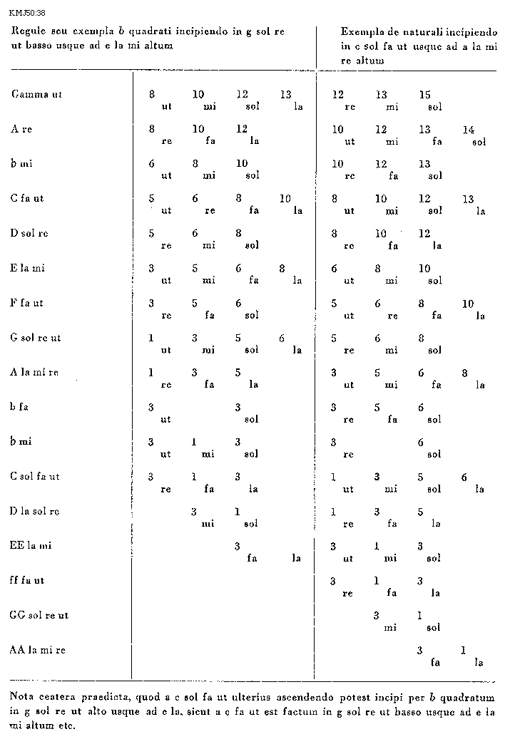 [KMJ50:38; text: Regule seu exempla b quadrati incipiendo in g sol re ut basso usque ad e la mi altum, Exempla de naturali incipiendo in c sol fa ut usque ad a la mi re altum, Gamma ut, A re, [rob] mi, C fa ut, D sol re, E la mi, F fa ut, G sol re ut, A la mi re, b fa, [rob] mi, C sol fa ut, D la sol re, EE la mi, ff fa ut, GG sol re ut, AA la mi re, 1, 3, 5, 6, 8, 10, 12, 13, 15, Nota ceatera praedicta, quod a c sol fa ut ulterius ascendendo potest incipi per b quadratum in g sol re ut alto usque ad e la, sicut a c fa ut est factum in g sol re ut basso usque ad e la mi altum et caetera.]