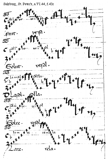 [f.43r][Salzburg, St. Peter's, a.VI.44, f.43r; text: fa in vt, vt in fa, faut. vt fa. sol in vt. vt in sol. Solut. vtsol. la in sol. sol in la. Dlasol. solla. sol in re. re in sol, Solre. resol. la in re. re in la. Lare. rela.]