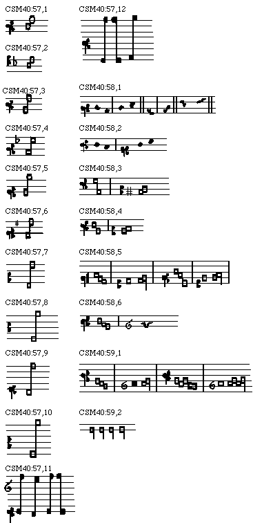 [CSM40:62; text: De unisono ad tertiam, de tertia ad quintam, de quinta ad sextam, de sexta ad octavam; de octava ad octavam et iterum de octava ad octavam, de octava ad decimam, de decima ad duodecimam; de octava ad sextam et de sexta ad decimam; de octava ad octavam sincopando; de sexta ad octavam sincopando]