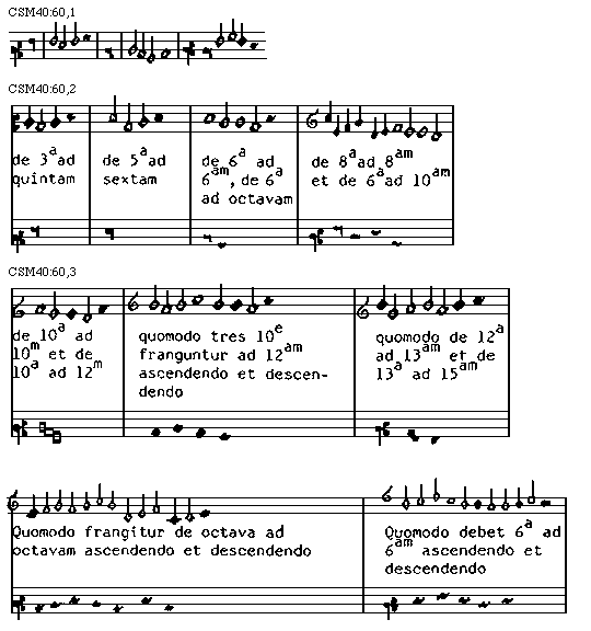 [CSM40:60,3; text: de decima ad decimam et de decima ad duodecimam; quomodo tres decimae franguntur ad duodecimam ascendendo et descendendo; quomodo de duodecima ad tredecimam et de tredecima ad quintadecimam; Quomodo frangitur de octava ad octavam ascendendo et descendendo; Quomodo debet sexta ad sextam ascendendo et descendendo]