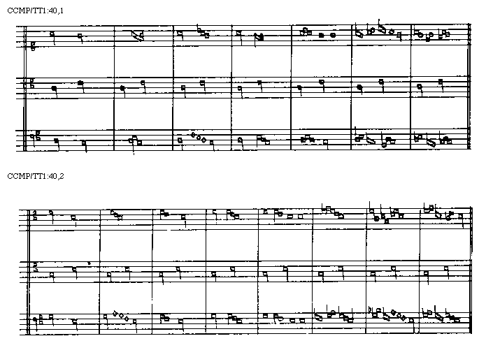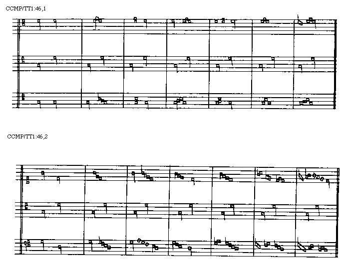 [8]Quandocumque duae semibreves inter duas longas vel breves [ms.: longas] inveniuntur, prima habebit unum tempus semibreve, secunda duo tempora semibrevia, ut hic: