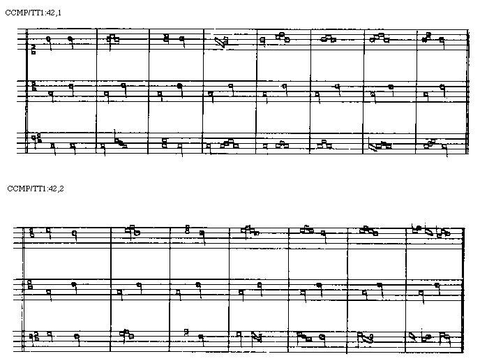 [42]Ad ascensum trium, incipiens in diapason supra vel in diapente infra, fac unisonum, ut hic: