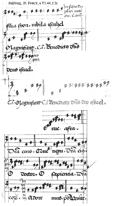 [f.3r][Salzburg, St. Peter's, a.VI.44, f.3r; text: filia Syon. iubila Israhel In festo duplici maiori. Canticum. Magnificat. Benedictus dominus deus Israel. [Canticum. Magnificat. Canticum. Benedictus dominus deus Israel in marg.] propria Erue afra. Differencia eius. Que nexu. proprium O doctor. O sapiencia. Differencia eorum. Invitatorium Adoremus. psalmus Venite.]