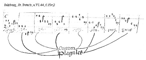 [f.18v][Salzburg, St. Peter's, a.VI.44, f.18v; text: Graues, [quasi voces primi aphabeti dicuntur graves. Ideo quia grauiter et remisse sonant. m.rec.], Finales, [Et dicuntur finales eo quod omnes cantus regulares in hys finiantur m.rec.], Acute, [Et dicuntur acute quia acutum reddunt sonum. Alio nomine dicuntur affinales quasi cum finalibus affinitatem habentes quia quandoque cantus in istis terminatur et non regulatur et cetera m.rec.], Superacute, [Et dicuntur superacute eo quod acumine acutas voces superant. m.rec.], Excellentes, [Et dicuntur excellentes quasi omnes alias generalitate procedentes quia excellunt ambitum formalem uniuscuiusque cantus. m.rec.], [Gamma], A, B, C, D, E, F, G, a, b, c, d, ee, ff, gg, aa, bb, cc, dd, vt, re, mi, fa, sol, la, [sqb] mi, Primus [sqb] duralis, Primus naturalis, Primus b mollis, Secundus [sqb] duralis, Secundus naturalis, Secundus b mollis, Tercius [sqb] duralis, Sunt prime trine sed sunt trine nec bine. Reformaciones, Proprietates, G [sqb] durum dat c naturam tibi signat et F est b mollis sic septem per tria tollis. Primus et alter d tenet c ternus quoque quartus. f quintus sextus g septimus atque supremus. Primus, Secundus, Tercius, Quartus, Quintus, Sextus, Septimus, Octauus, Autentus, Magister, Dominus, Prelatus, Plgalis, Discipulus, Seruus, Subditus, finalis, Prothus. Deutrus. Tritus. Tetrardus. In Dsolre primus finit tonus atque secundus. Tercium wlt Elami quartumque sibi sociari. Efaut est meta quinto sextoque repleta. Finit Septenum Gsolreut atque supremum. Est primus tonus re la. re fa que secundus Tercius est mi fa sed quartus sit in mi la Fa fa tonus quintus fa la accipit sextus Septimus vt sol Octauus dicitur vt fa, Pri re la se re fa ter mi fa quar quoque mi la Quin fa fa sex sit la sept vt sol oc tenet vt fa, Tenores sunt ille voces in quibus tropus maxime vsatur et presertim versus Responsoriorum et Introituum, Tenor primi, Tenor secundi, Tenor tercy, Tenor quarti, Tenor quinti, Tenor sexti, Tenor septimi, Tenor octaui .Exemplum Tenorum. .Exemplum Affinium. Tenores quantum ad Affines. Nota Quod isti cantus qui in proprio cursu cantari nequeunt vt sepe contingit. necessario habent recursum ad voces superiores proprys id est ad Affines. In eleuacione et deposicione cum eis conuenientibus. et signantur In hoc exemplo. Item Nota quod tropus tetrardus affines non recipit quia d cum g non conuenit in eleuacione et deposicione.]