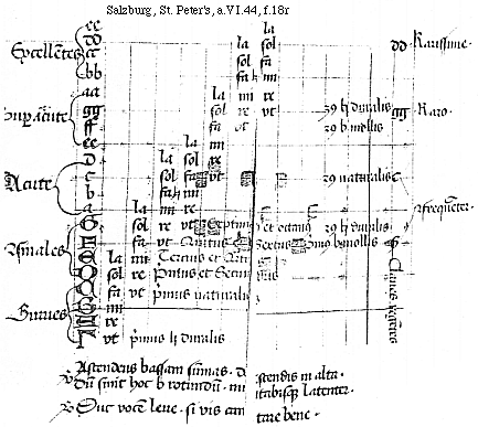 [f.18r][Salzburg, St. Peter's, a.VI.44, f.18r; text: Graues, Finales, Acute, Superacute, Excellentes, [Gamma], A, B, C, D, E, F, G, a, b, c, d, ee, ff, gg, aa, bb, cc, dd, vt, re, mi, fa, sol, la, [sqb]mi, Primus et Secundus, Tercius et Quartus, Quintus et Sextus, Septimus et octauus, primus [sqb] duralis, primus naturalis, primus b mollis, secundus [sqb] duralis, secundus naturalis, secundus b mollis, tercius [sqb] duralis, Claues regentes, et frequenter. Raro. Rarissime. Ascendens bassam suma. Descendis in alta. Versus Dum sunt hoc b rotundum. mutabisque latenter. Versus Duc vocem lene. si vis cantare bene.]