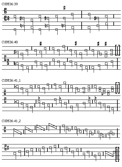 Et nota quod, si tu cantas mi in b fa [sqb] my acuto, oportet te dicere etiam my in f fa ut acuto per falsam musycam et signum facere taliter formatum [sqb], sicut poteris videre exemplo sequenti: