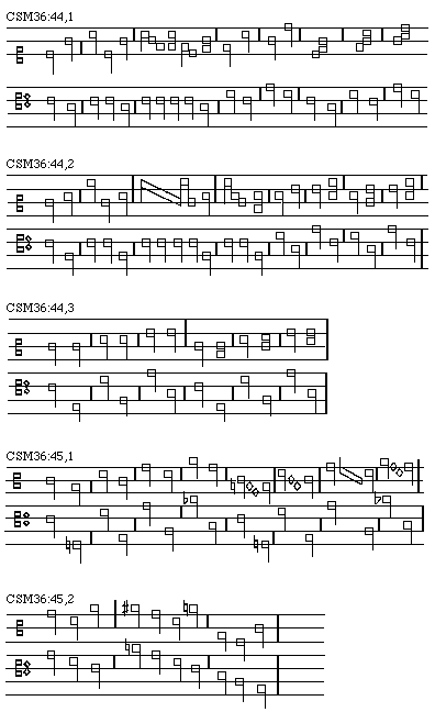 [43]Nota quod, si cantus ascendat duos tonos sive duos cum dimidio aut tres aut quatuor, debemus incipere in dyapason et descendere in dyapente. Hoc est dicere quod debemus incipere in duplo et descendere in quintum, et ascendere sicut cantus ascendit ut hic patet exemplo: