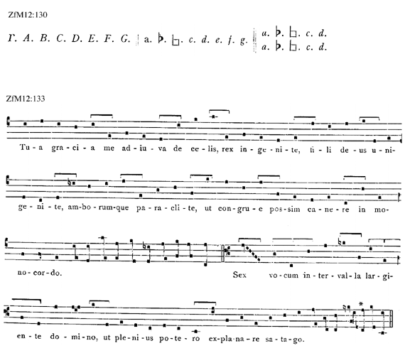 [ZfM12:133; text: Tua gracia me adiuva de celis, rex ingenite, fili deus unigenite, amborumque paraclite, ut congrue possim canere in monocordo. Sex vocum intervalla largiente domino, ut plenius potero explanare satago.]