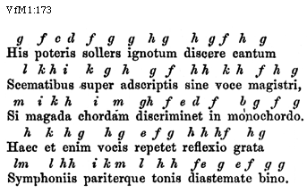 [173][VfM1:173; text: g, f, c, d, h, l, k, i, m, e, b, His poteris sollers ignotum discere cantum Scematibus super adscriptis sine voce magistri, Si magada chordam discriminet in monochordo. Haec et enim vocis repetet reflexio grata Symphoniis pariterque tonis diastemate bino.]