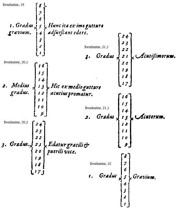 [Beurhusius, 20,1; text: Secundus Medius gradus. 16, 15, 14, 13, 12, 11, 10, 9, Hic ex medio gutture acutius promatur.]