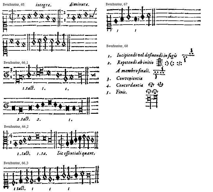 [Beurhusius, 68; text: 1. Incipiendi vel desinendi in fugis, 2. Repetendi ab initio, A membro finali. 3. Convenientiae, 4. Concordantiae, 5. Finis.]