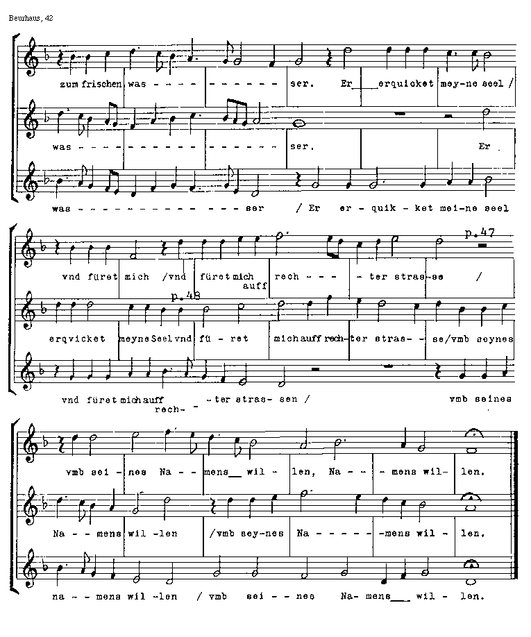 [42][Beurhaus, 42; text: zum frischen wasser. Er erquicket meyne seel /, meine, vnd fueret mich auff rechter strasse / vmb seines Namens willen. seyne, /p.47/, /p.48/]
