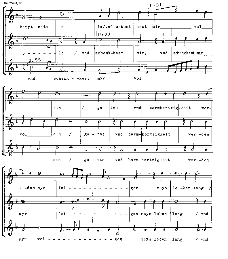 [45][Beurhaus, 45; text: p.55, p.51, p.53, haupt mit oele, vnd schenkkest mir vol ein / gutes vnd barmhertzigkeit werden myr folgen meyn leben lang/]