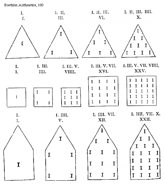 IIII. Haec quidem de quantitate, quam secundum ad [?] aliquid speculamur, ad praesens dicta sufficiant. Nunc autem in hac sequentia quaedam de ea quantitate, quae per se ipsam constat, neque ad aliquid refertur, expediam, quae nobis ad ea prodesse possint, quae post haec rursus de relata ad aliquid quantitate tractabimus. Amat enim quodammodo matheseos speculatio alterna probationum ratione constitui. Nunc autem nobis de his numeris sermo futurus est, qui circa figuras geometricas et earum spatia demensionesque versantur, id est de linearibus numeris et de triangularibus vel quadratis ceterisque, quos sola pandit plana demensio, nec non de inaequali laterum compositione coniunctis; de solidis etiam, id est cybis et sphericis vel pyramidis, laterculis etiam vel tignulis et cuneis, quae omnia quidem geometricae propriae considerationis sunt, sed sicut ipsa geometriae scientia ab arithmetica velut quadam radice ac matre producta est, ita etiam eius figurarum semina in primis numeris invenimus, planum siquidem fecimus, quod omnes disciplinas haec interempta consumeret, quas minime constituta firmaret. Hoc autem cognoscendum est, quod haec signa numerorum, quae posita sunt, quae nunc quoque homines in summarum designatione describunt, non naturali institutione formata sunt. Ut enim quinarii subiectam notulam