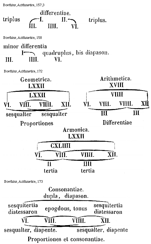 Omnes autem in hac dispositione symphonias musicas invenimus. Diatessaron quidem est .VIII. ad .VI., quoniam proportio sesquitertia est, at diapente .XII. ad .VIII., quoniam, quae sesqualtera comparatio dicitur, in ea diapente consonantia repperitur. Diapason vero quae ex duplici nascitur, ex .XII. ad .VI. compositione producitur. Diapason vero et diapente, quae triplicis obtinent rationem, fit ab extremitatum differentia ad differentiam minorem. Namque duodenarii et senarii .VI. differentia est, minor vero est differentia octonarii et senarii, id est .II.; qui senarius ad binaria triplus est, et diapason simul et diapente consonantiam sonant. Illa vero maior consonantia, quae est bis diapason, quae ex quadruplo fit, in medii
